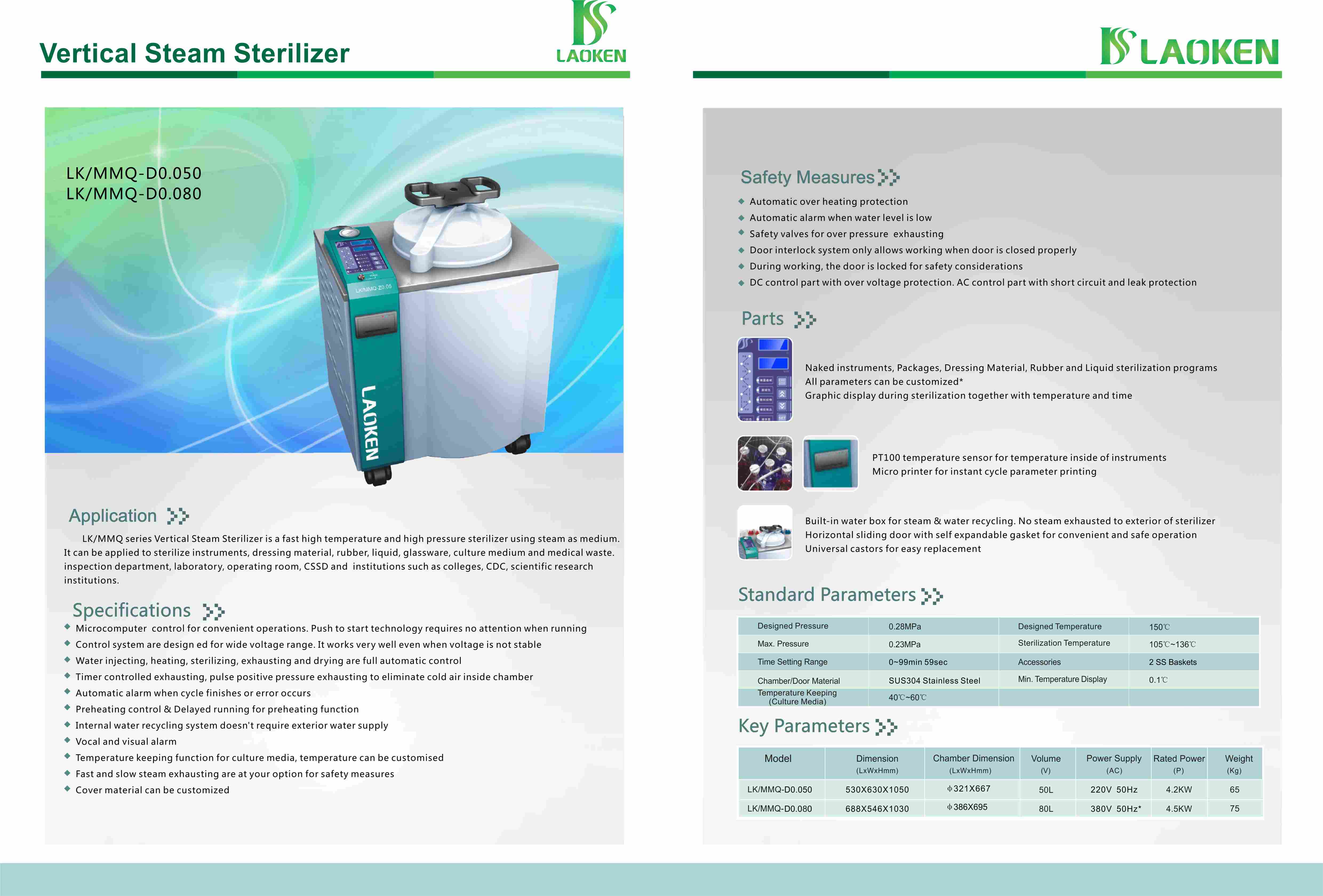 LK/MMQ series vertical steam sterilizers is a fast high temperature and high presure sterilizer using steam as medium. It can be applied to sterilize instruments, dressing material, rubber, liquid, glassware, culture medium and medical waste, inspection department, laboratory, operating room, CSSD and institutions such as colleges, CDC and scientific research instruments.